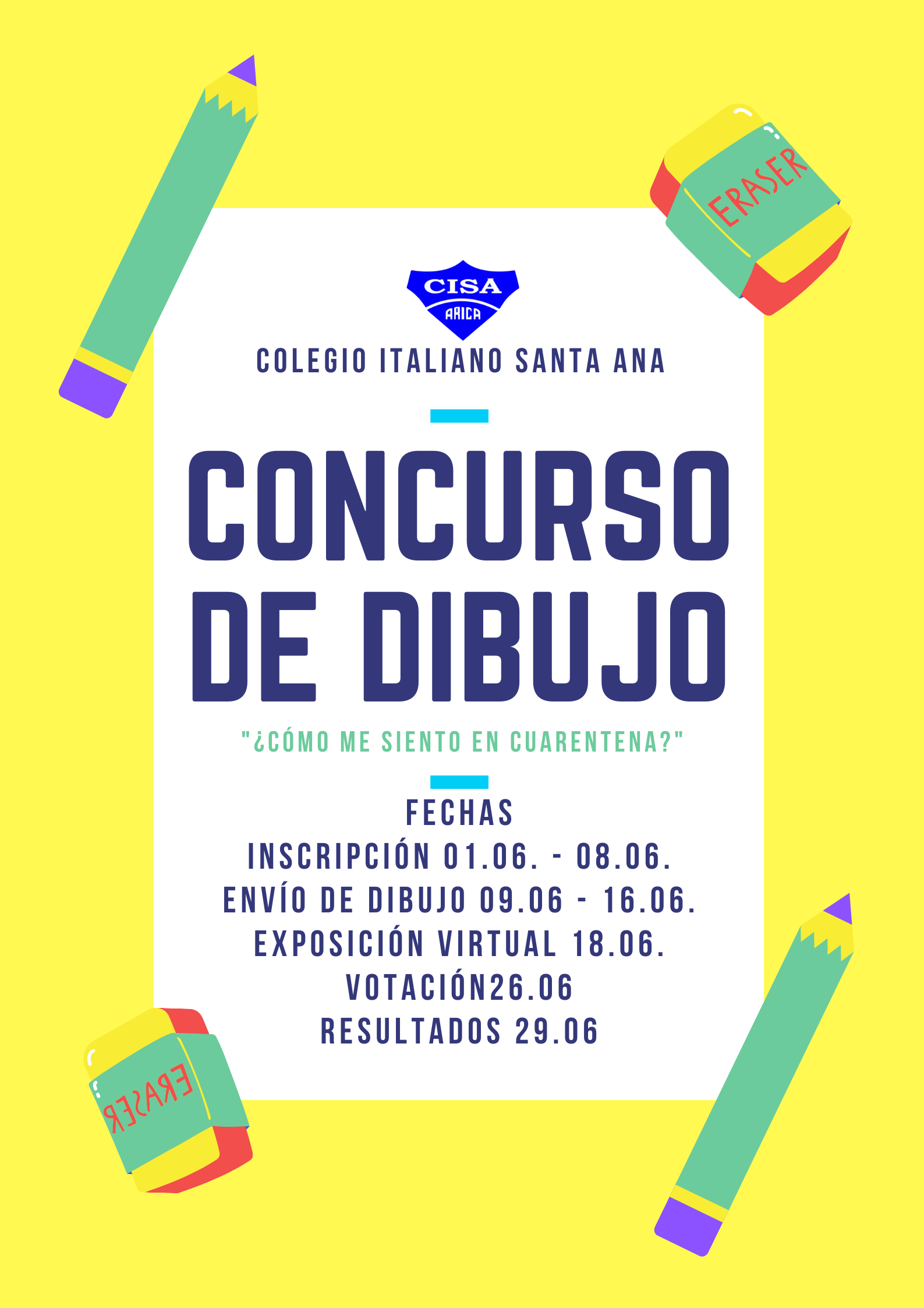 Los invitamos a participar del concurso de DIBUJO CISA con el tema ¿Cómo me siento en cuarentena? Esta actividad organizada por el Equipo Psicosocial y Convivencia Escolar busca que puedas expresar tus emociones a través del arte terapia.