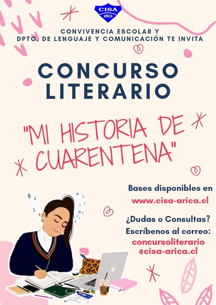 Los invitamos a participar del Concurso Literario CISA con el tema “Mi historia de cuarentena”. Esta actividad organizada por Convivencia Escolar y el Dpto. de Lenguaje y Comunicación busca que nuestras alumnas y apoderados se expresen a través de historias, cuentos, poemas y otros medios de creación literaria.