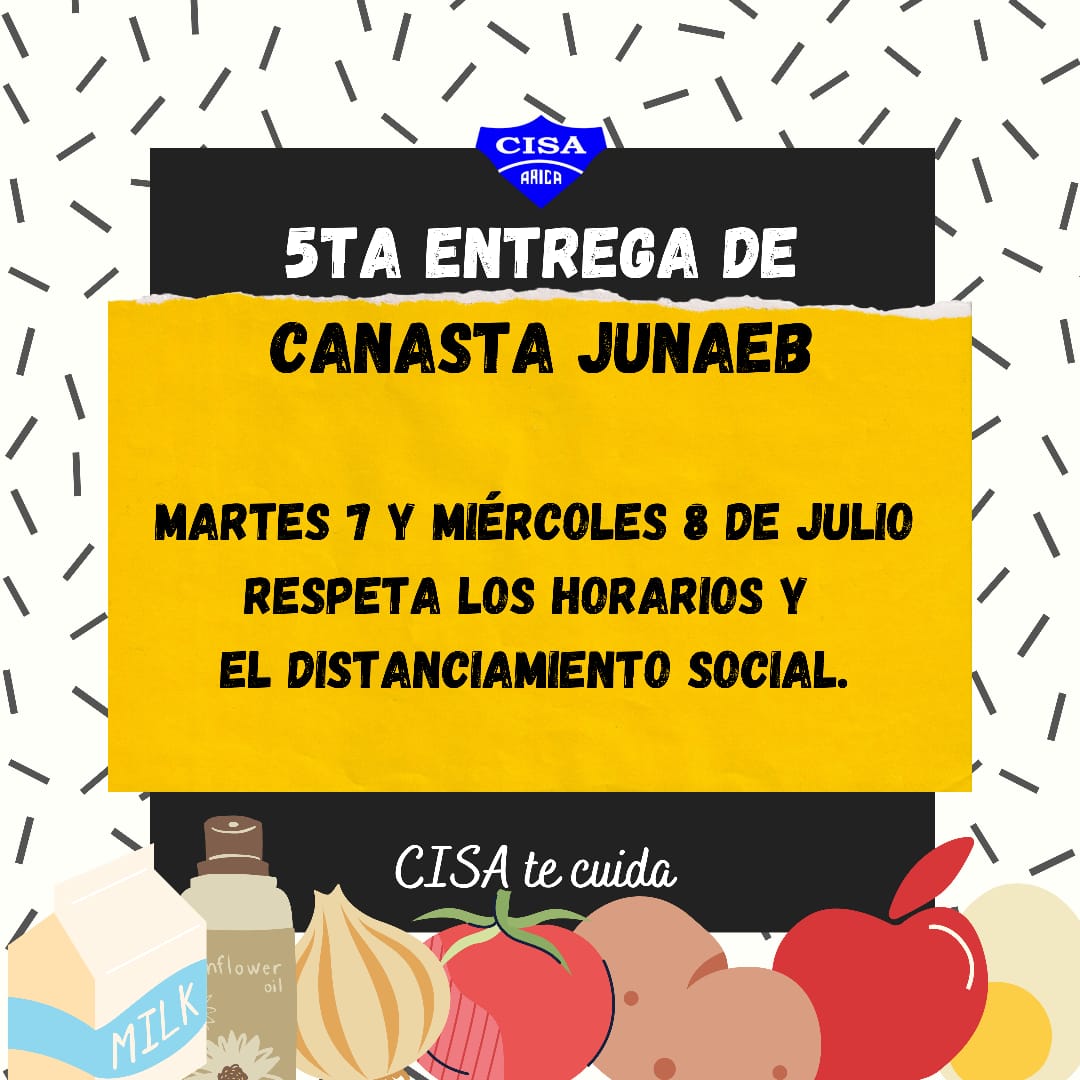 Junto con saludar y deseando que se encuentren bien junto a sus seres queridos, comunicamos que hemos recibido la 5ta canasta JUNAEB, en esta ocasión sólo ha llegado el 64% del total de las raciones por alumna beneficiaria del programa de alimentación escolar (PAE), por lo que si ya recibió su canasta durante la semana del 15 de junio es posible que en esta oportunidad no le corresponda.