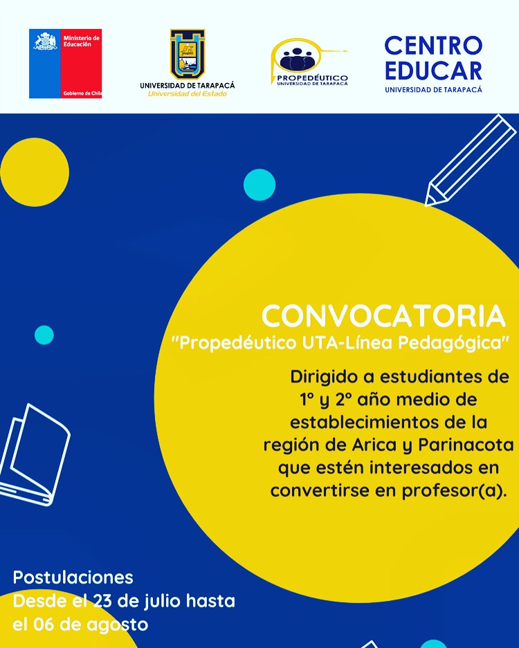 Junto con expresar un cordial saludos, informamos que la Universidad de Tarapacá invita a las estudiantes de 1° y 2° año medio a participar del Programa Propedéutico Línea Pedagógica UTA año 2020.