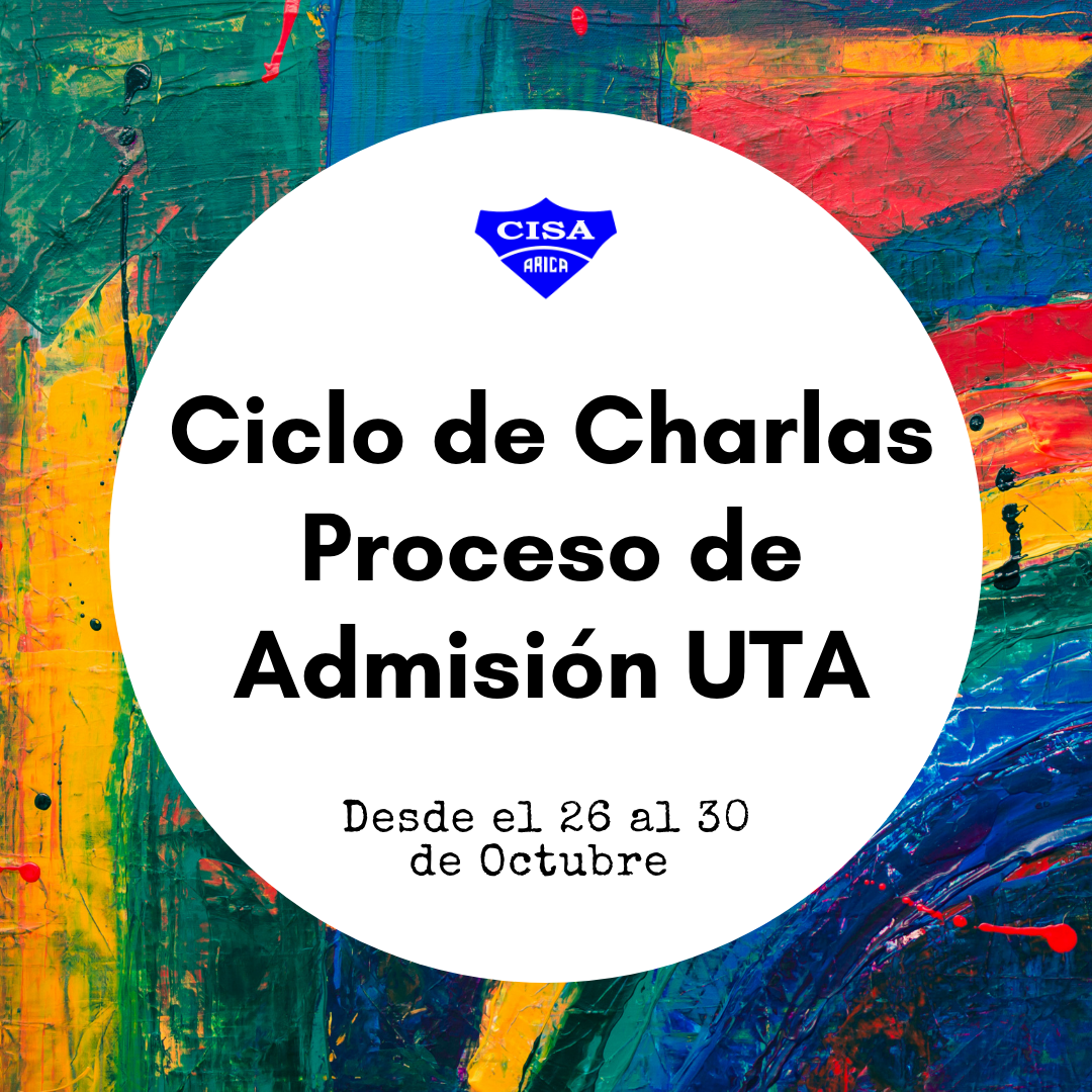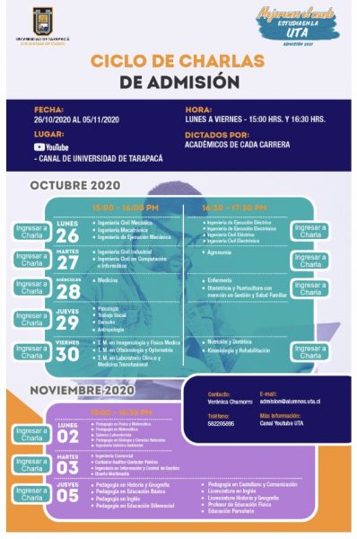 Junto con saludar y esperando que se encuentre bien de salud, La Universidad de Tarapacá invita a los estudiantes de enseñanza media a un ciclo de charlas de la “Oferta Académica Admisión UTA 2021”,que se desarrollarán desde el 26 de octubre al 05 de noviembre,dictadas por Jefes de Carreras y Académicos de cada una de las Facultades Arica