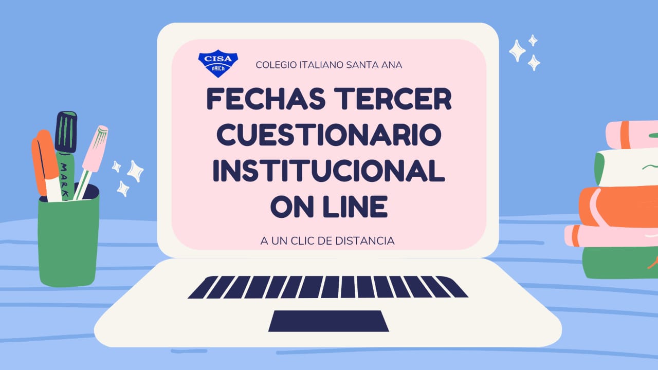 Junto con saludarlos, queremos recordar que desde el jueves 17 hasta el miércoles 30 de Junio se encontrarán disponibles los 3eros cuestionarios institucionales de carácter obligatorio desde las 8:00 hasta las 23:59 hrs en la plataforma www.arica.aulavirtualsantaana.cl.