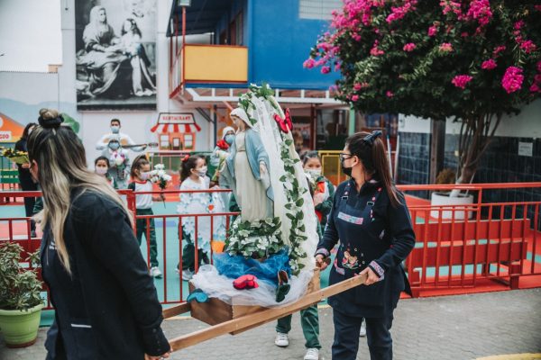 Finalizamos con el día Jueves 11 de noviembre, la Virgen Peregrina de la Esperanza recorre los pasillos de nuestro colegio y son las niñas de 1 Básico B quienes llevan su presencia a las estudiantes de 3 Medio A, quienes la acogen con cantos y oraciones: “Conforta, Madre de la Esperanza, a quienes atraviesan momentos de oscuridad o desaliento, así como a los que nuestra sociedad margina.”