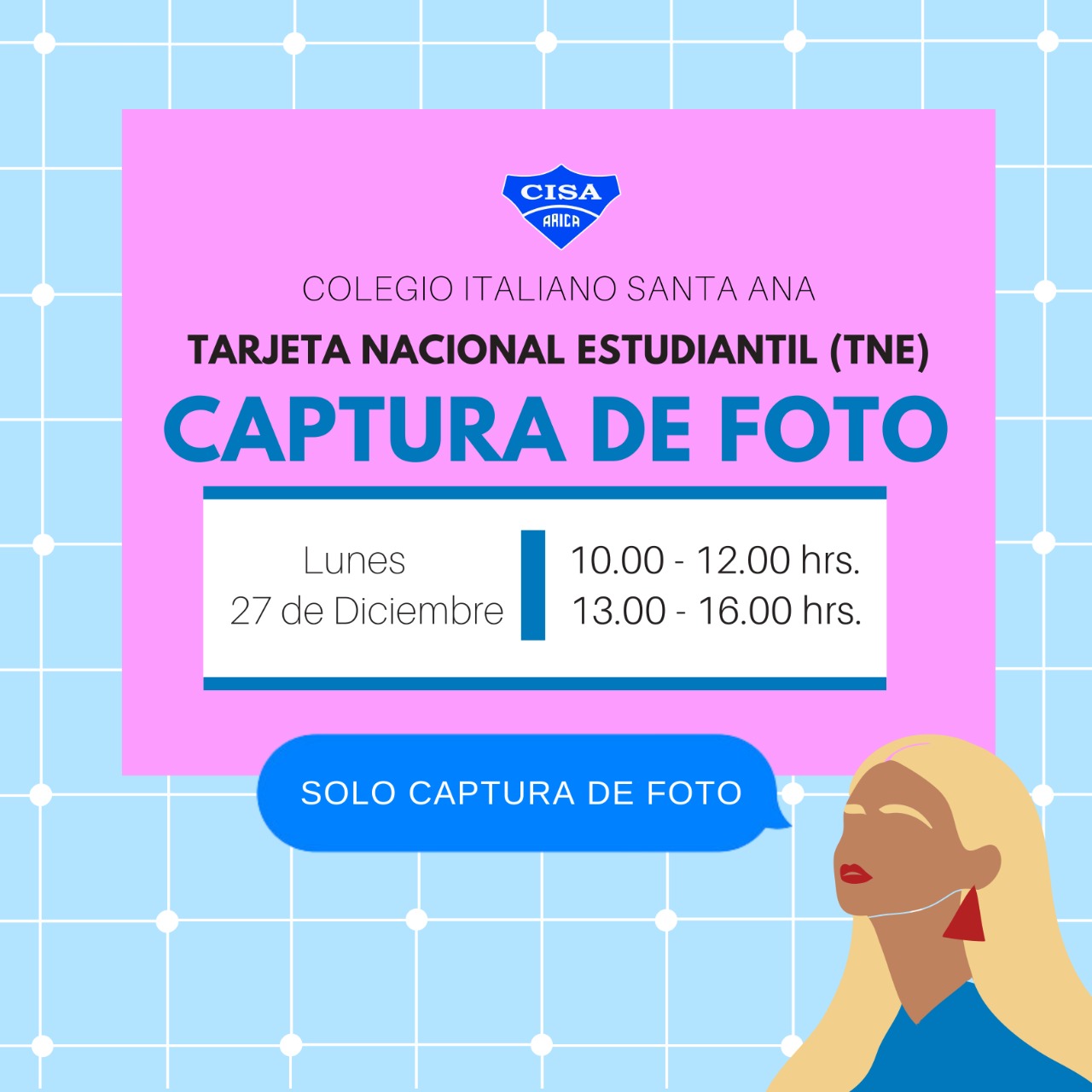 Hoy Lunes 27 de diciembre el módulo itinerante para sacarse la foto de la TNE se encontrará en nuestro colegio desde las 10:00 hasta las 12:00 horas y desde las 14:00 hasta las 16:00 horas.