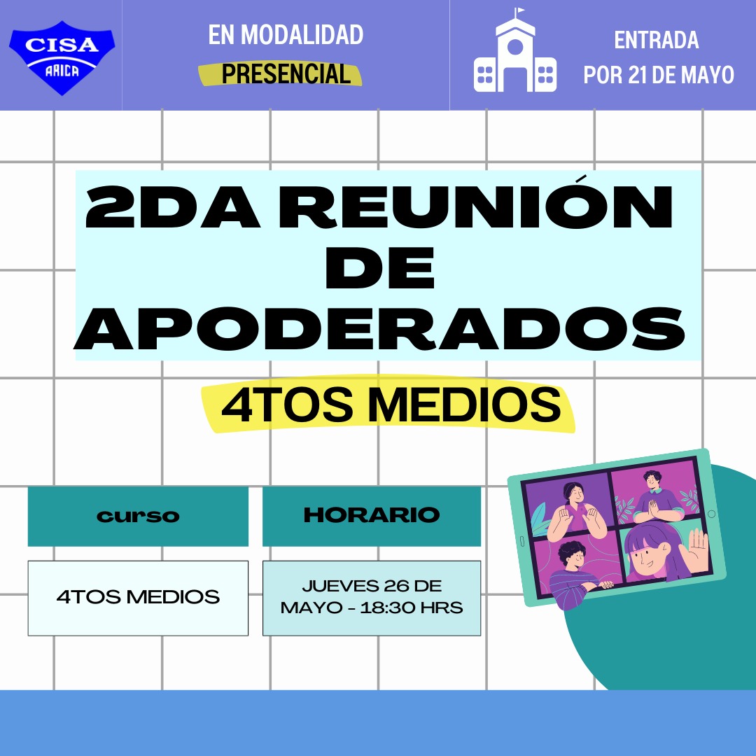 Junto con saludar y desear que se encuentren bien junto a su familia, informamos que se llevará a cabo la 2da Reunión de Padres y Apoderados, de manera presencial para los 4tos medios el jueves 26 de mayo a las 18:30 hrs.