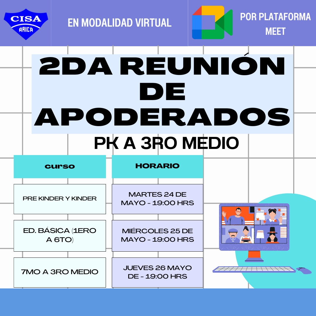 Junto con saludar y desear que se encuentren bien junto a su familia, informamos que se llevará a cabo la 2da Reunión de Padres y Apoderados de manera on line, los siguientes días a las 19:00 hrs a través de la aplicación Meet.