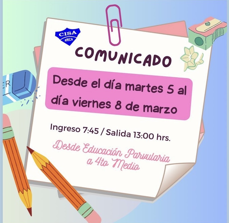 Se informa que esta primera semana de retorno a clases, la jornada se iniciará a las 07:45 horas y finalizará a las 13:00 horas. Este horario es para TODOS LOS NIVELES.