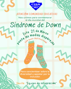 Día Mundial Síndrome de Down Posted on Marzo 20, 2025Marzo 20, 2025 by Jeannette Rivera Todos nos sumamos para decir que en la diferencia somos iguales. Mañana viernes 21 asiste con buzo y con medias de diferente color para ser parte de la campaña. ImprimirImprimir