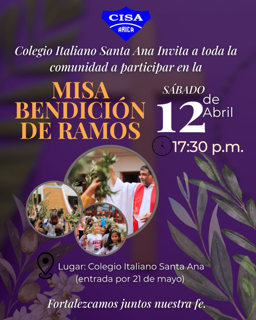 Les invitamos cordialmente a participar en la Misa de este sábado 12 de abril, en la que se realizará la Bendición de Ramos. Estos ramos han sido elaborados con mucho cariño por las tías técnicos y algunas estudiantes del colegio, con el deseo de que puedan llevarlos a sus hogares y así compartir esta bendición en familia.